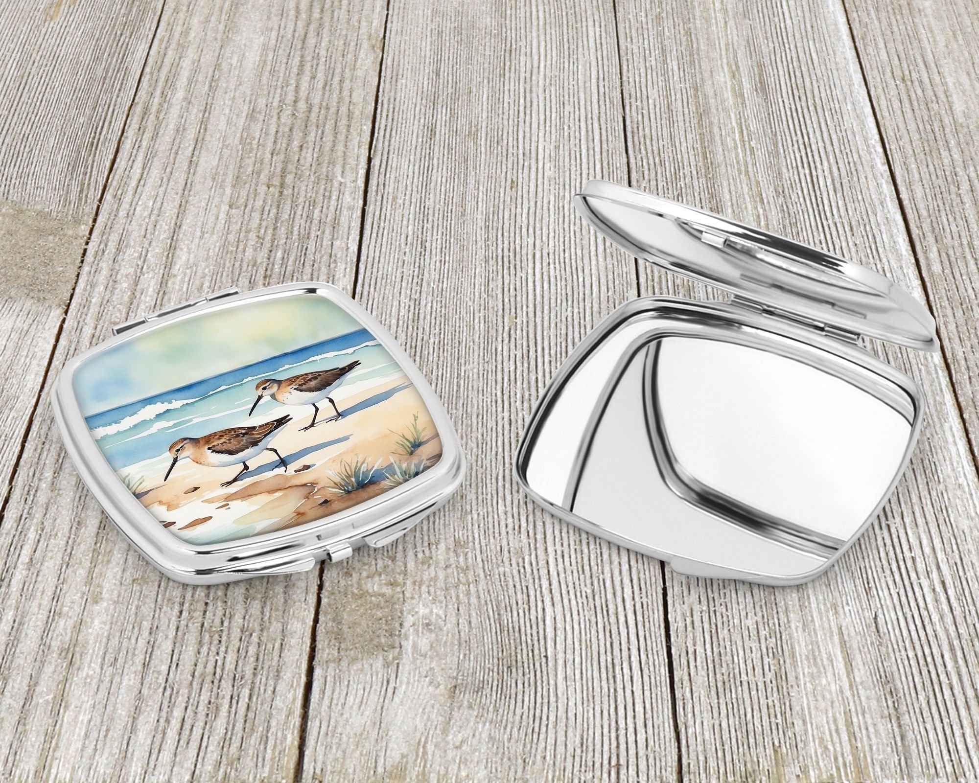 Compact Mirror featuring breed specific Sandpipers artwork. Introducing our Square Compact Mirror, a blend of elegance, functionality, and compactness, perfect for on-the-go touch-ups. This Silvertone metal mirror, with dimensions of 2.75 inches x 3 inches x .3 inches, fits effortlessly into your purse, handbag, or pocket, ensuring that you can check your appearance anytime, anywhere. Our compact mirror stands out with its eye-catching artwork on the front, adding a dash of style to this practical accessory. It is more than just a mirror; it's a statement piece that reflects your personality and aesthetic. When opened, this compact reveals two mirrors inside, doubling your perspective for precise touch-ups. The Silvertone metal construction ensures durability while maintaining a lightweight feel, making it an ideal everyday carry item. Whether you're rushing to a meeting, prepping for a dinner date, or just need a quick check on your look, our Square Compact Mirror is your reliable companion. Experience the perfect blend of style and practicality with this must-have accessory.